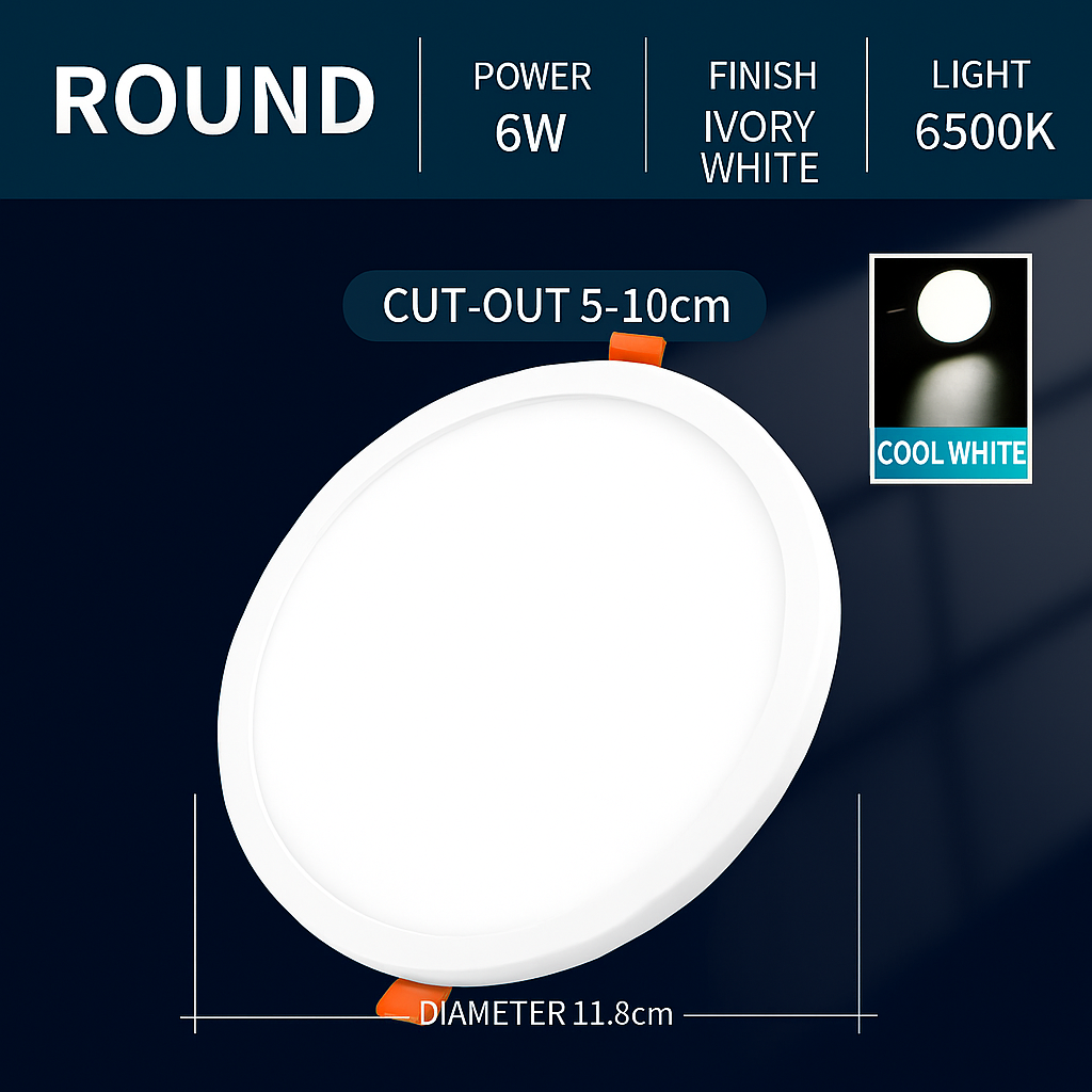 Compact and efficient, this 6W circular panel light delivers soft, uniform lighting ideal for small rooms, hallways, or accent areas. Its slim, modern design makes it easy to install and perfect for ceilings with limited space.