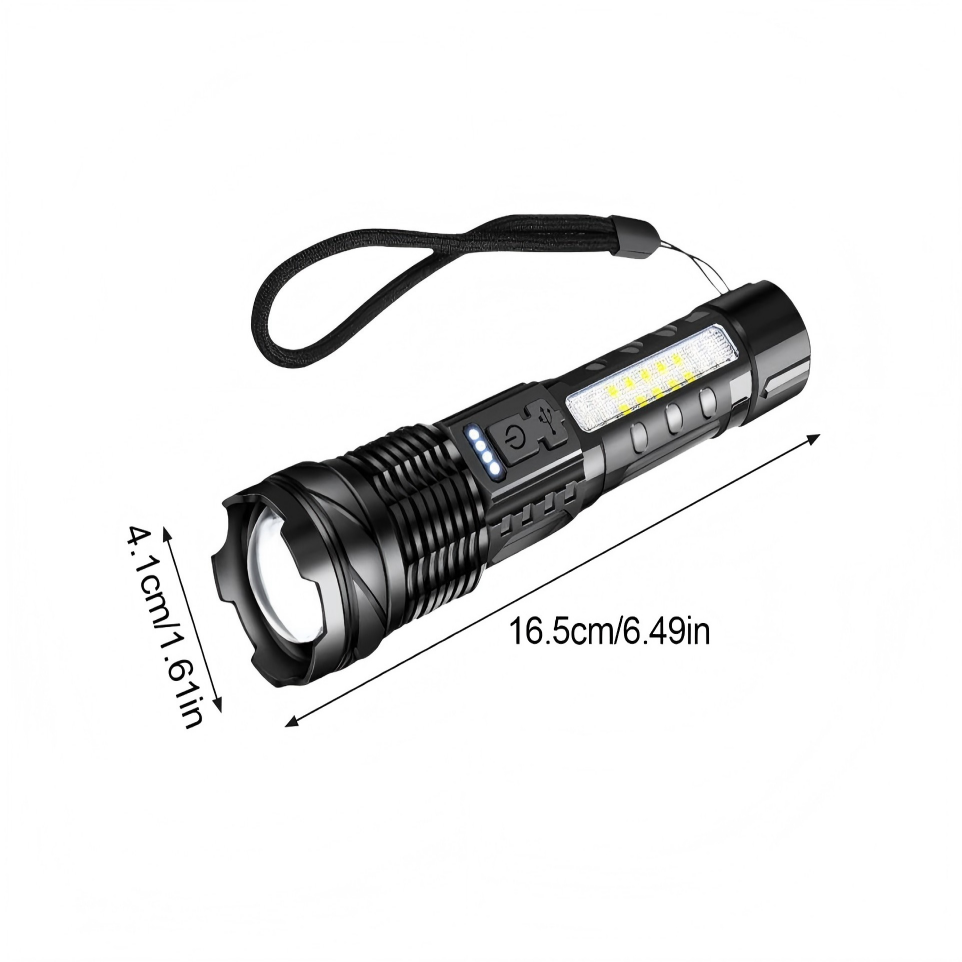 This high-powered torch features a front beam with adjustable focus and a built-in side panel of 10 LEDs to adapt to multiple scenarios including emergency, inspection, camping, and hiking.