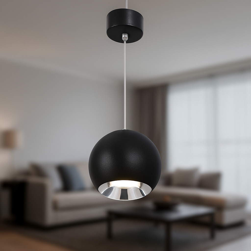 Add a modern and elegant touch to your interior with this spherical pendant light. Made from durable aluminium and acrylic, it features a sand black finish with a chrome accent, creating a sleek visual contrast. Ideal for kitchen islands, bars, or modern living areas. The 7W GU10 LED bulb (4000K) delivers crisp, neutral white light, perfect for ambient or task lighting.