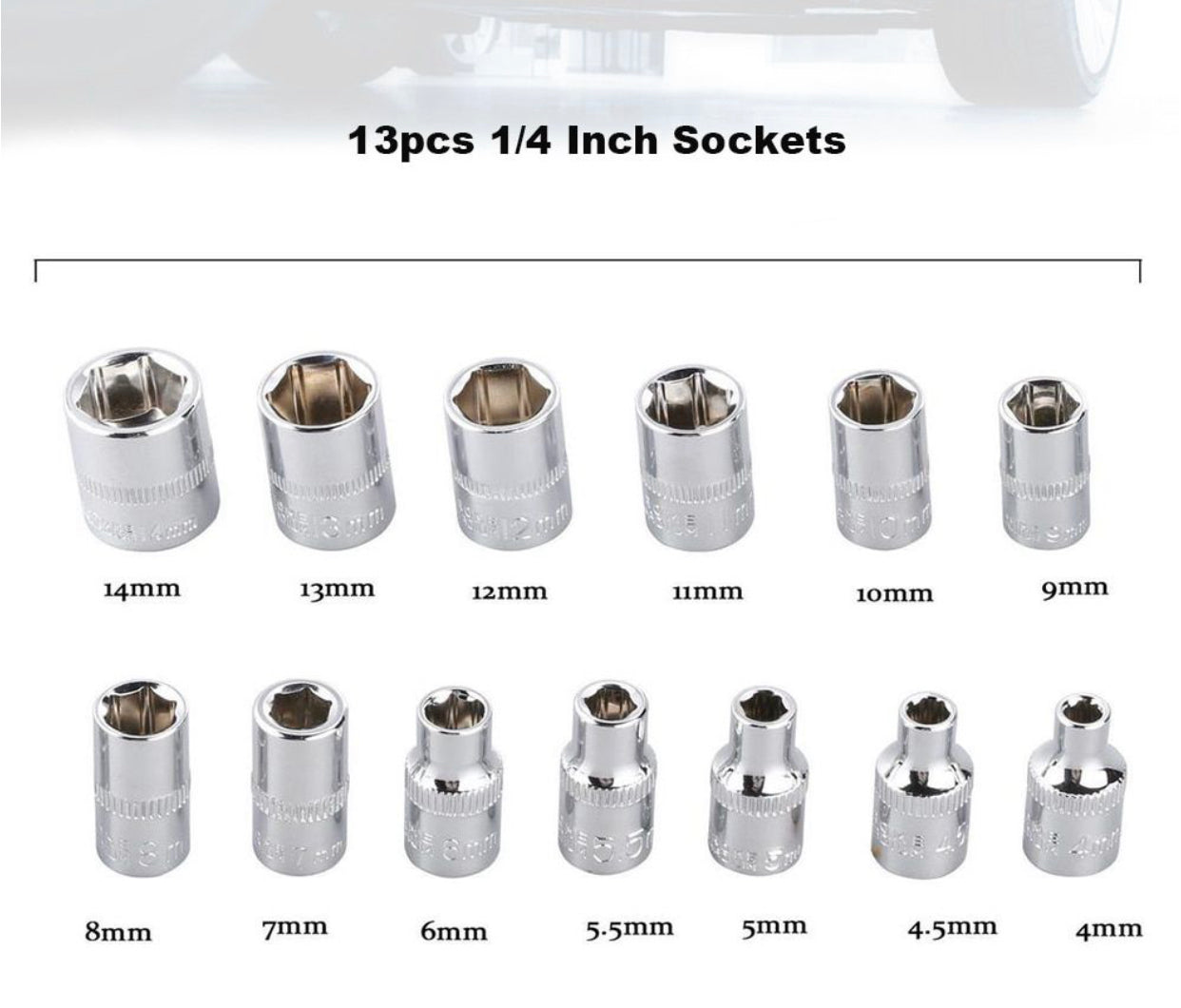 13pcs 1/4 inches DR sockets: 4, 4.5, 5, 5.5, 6, 7, 8, 9, 10, 11, 12, 13, 14mm
